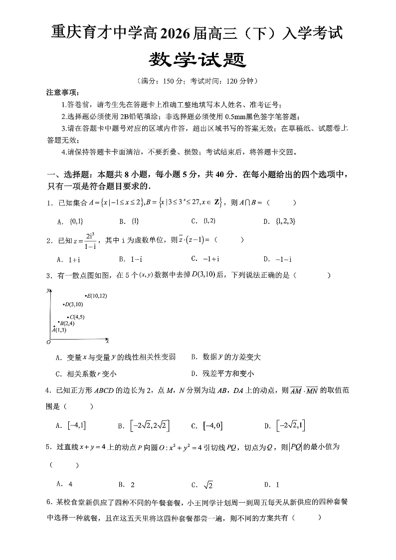 重庆育才中学高2026届高三(下)入学考试 数学.pdf