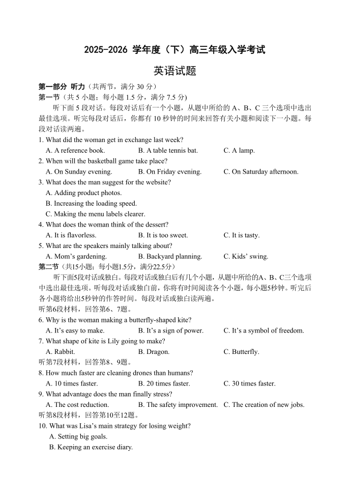 重庆市第八中学校2025-2026学年度(下)高三年级入学考试 英语.pdf