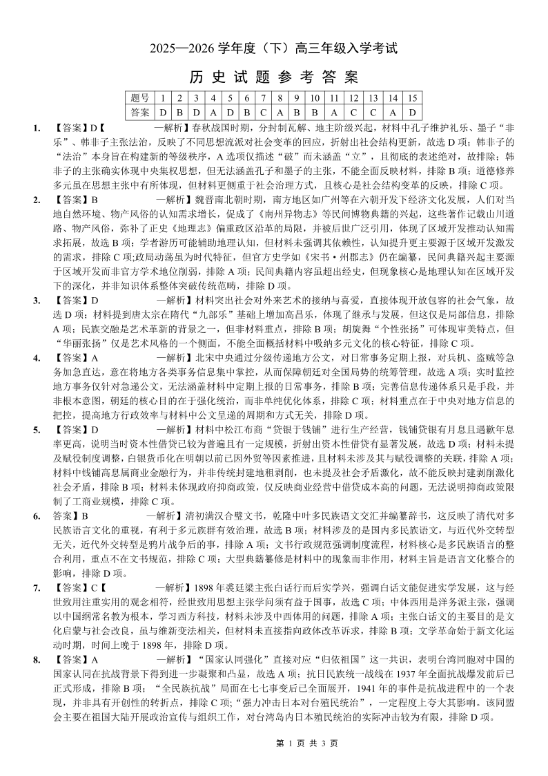 重庆市第八中学校2025-2026学年度(下)高三年级入学考试 历史答案.pdf