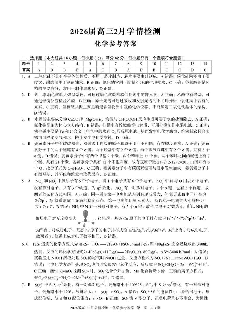 安徽省·A10联盟2026届高三下学期2月学情检测 化学答案.pdf