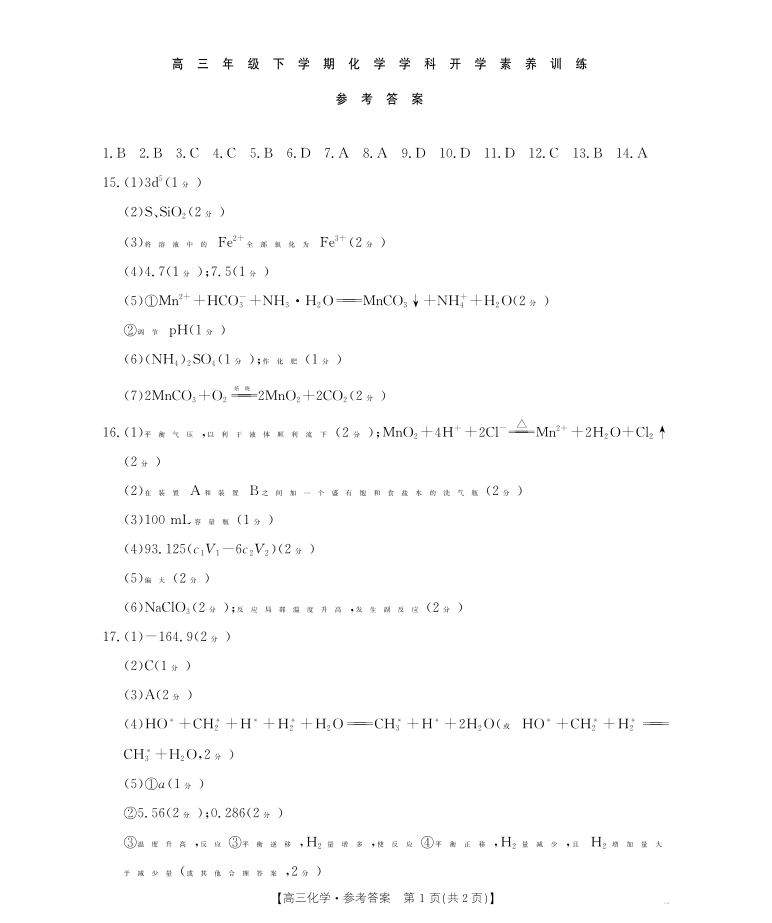 江西省2025-2026学年高三下学期2月开学素养训练 化学答案.pdf