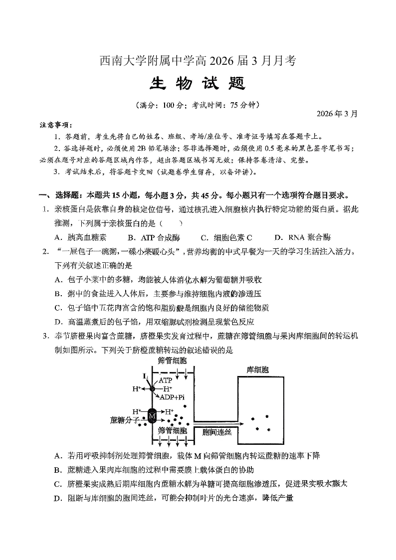 重庆西南大学附中高2026届高三下3月定时检测 生物.pdf