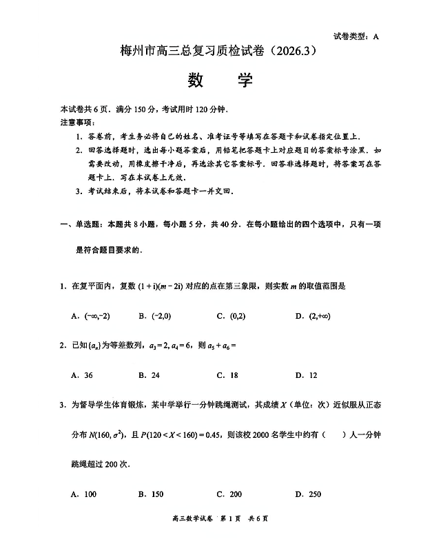 广东省梅州市高三总复习质检试卷(2026.3)数学.pdf