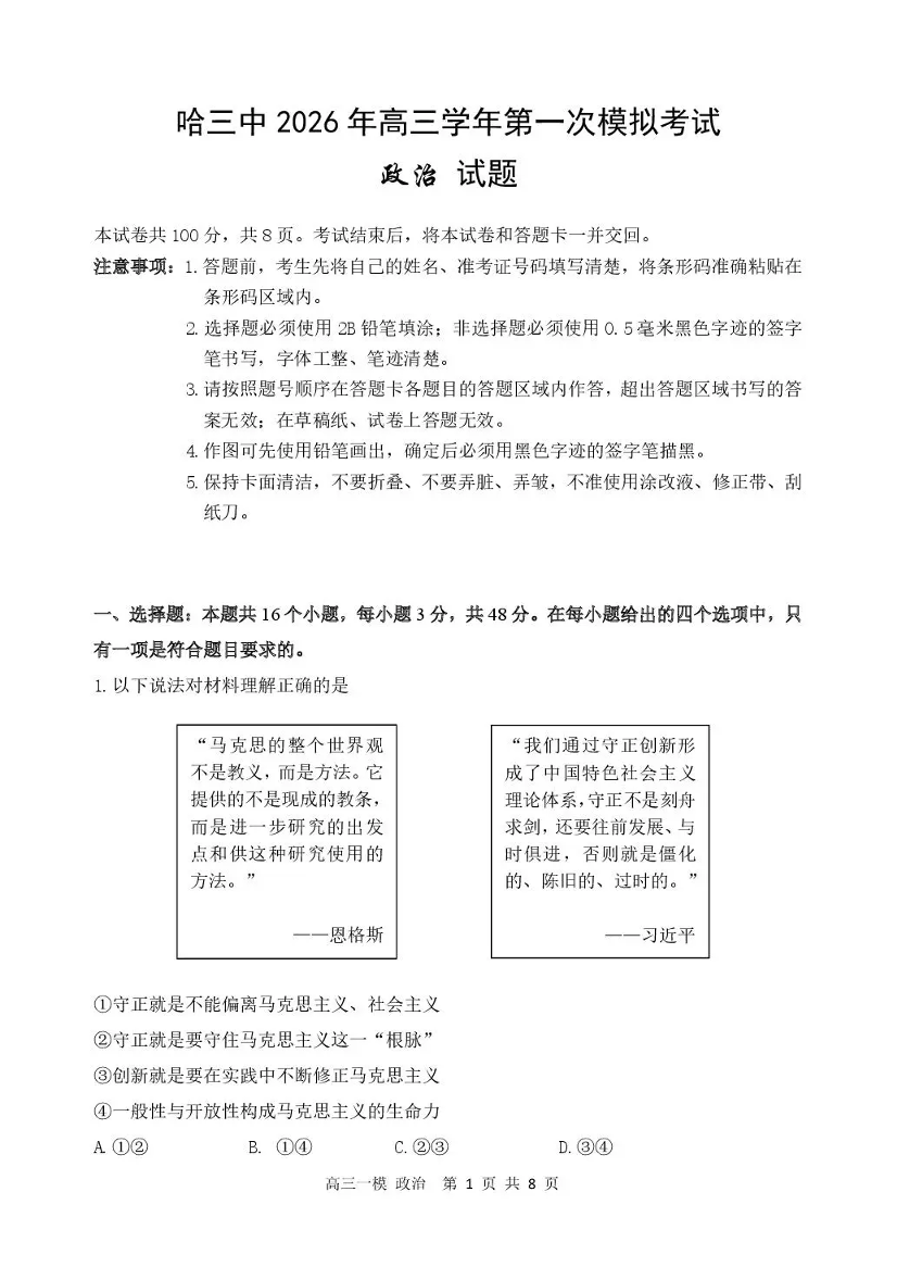 哈三中2026年高三学年第一次模拟考试 政治.pdf