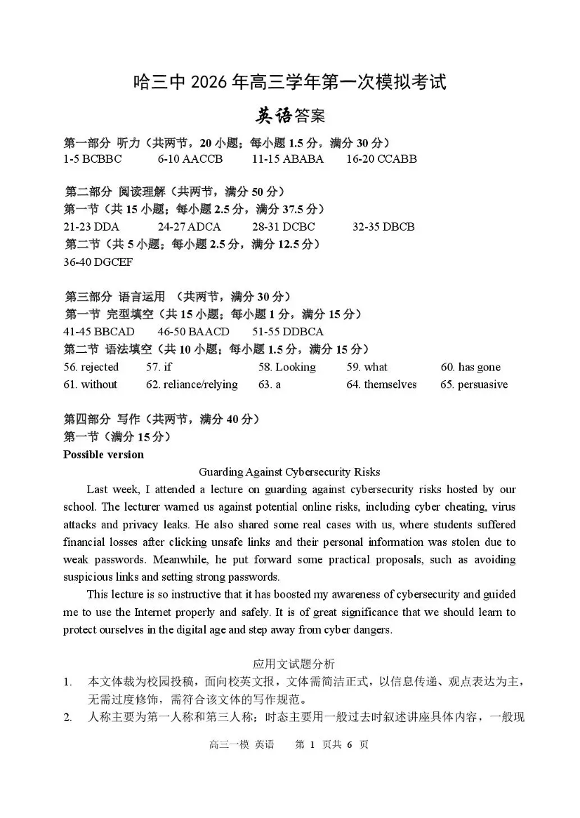 哈三中2026年高三学年第一次模拟考试 英语答案.pdf