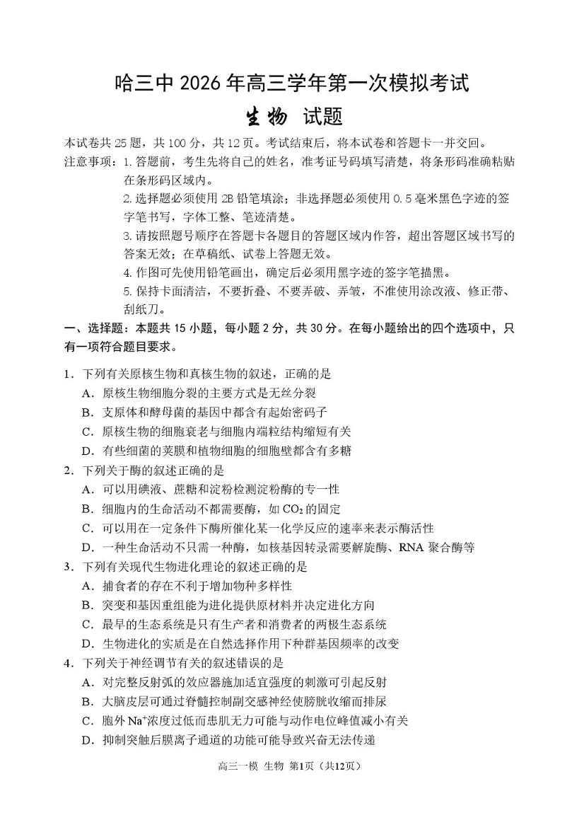 哈三中2026年高三学年第一次模拟考试 生物.pdf