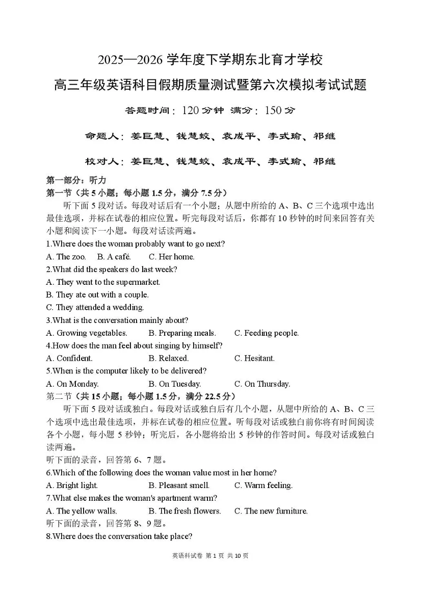 东北育才学校2025-2026学年高三下学期第六次模拟考试 英语.pdf