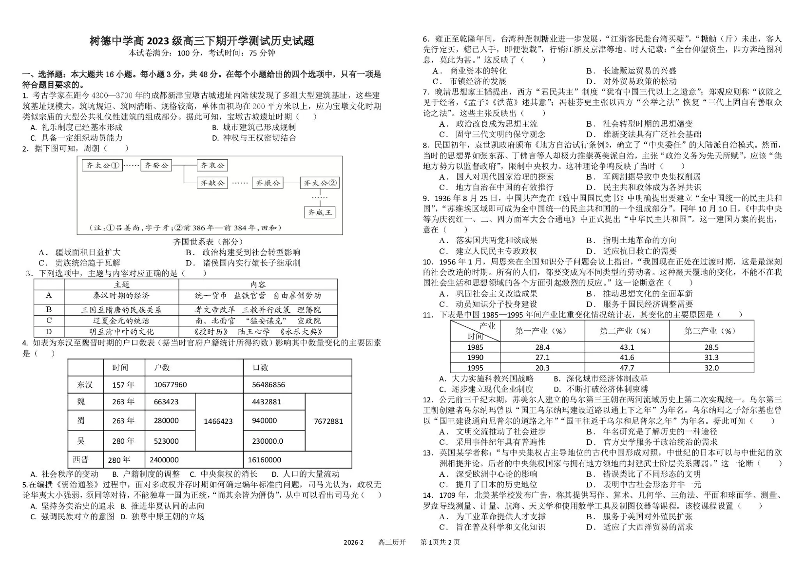 树德中学高2023级高三下期开学考试 历史试题(含答案).pdf