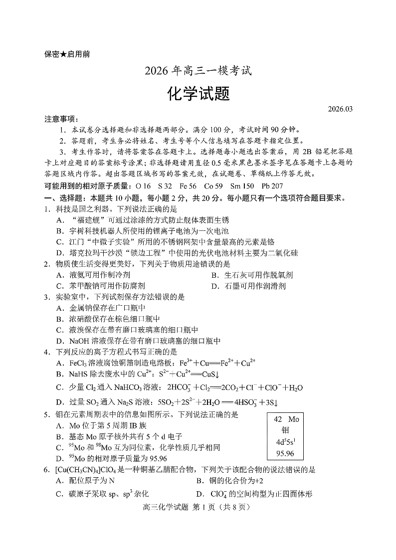 菏泽市2026年高三一模考试 化学试题(含答案).pdf