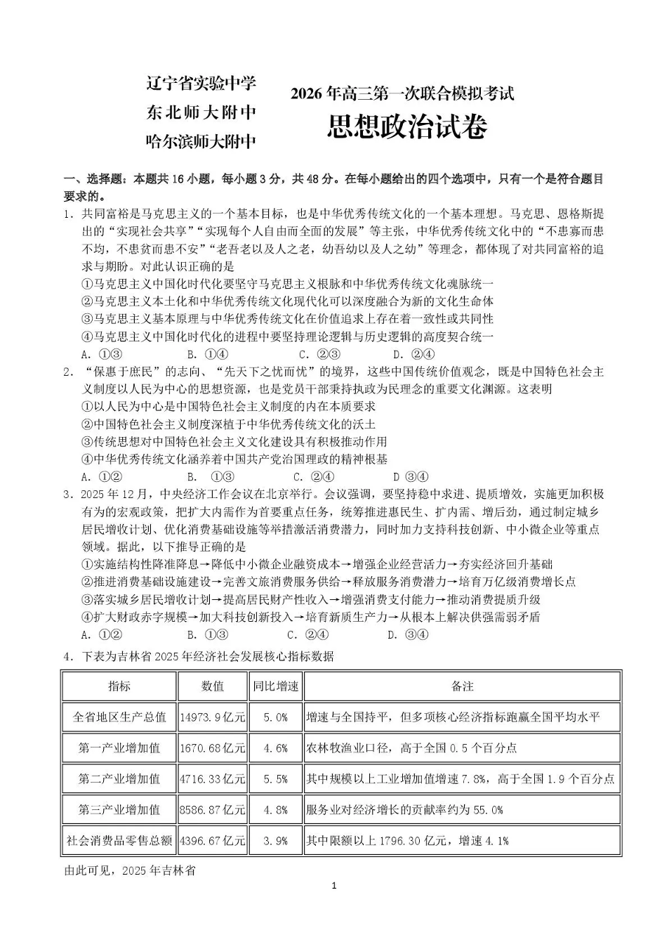 东北三省三校2026年高三第一次联合模拟考试 政治.pdf