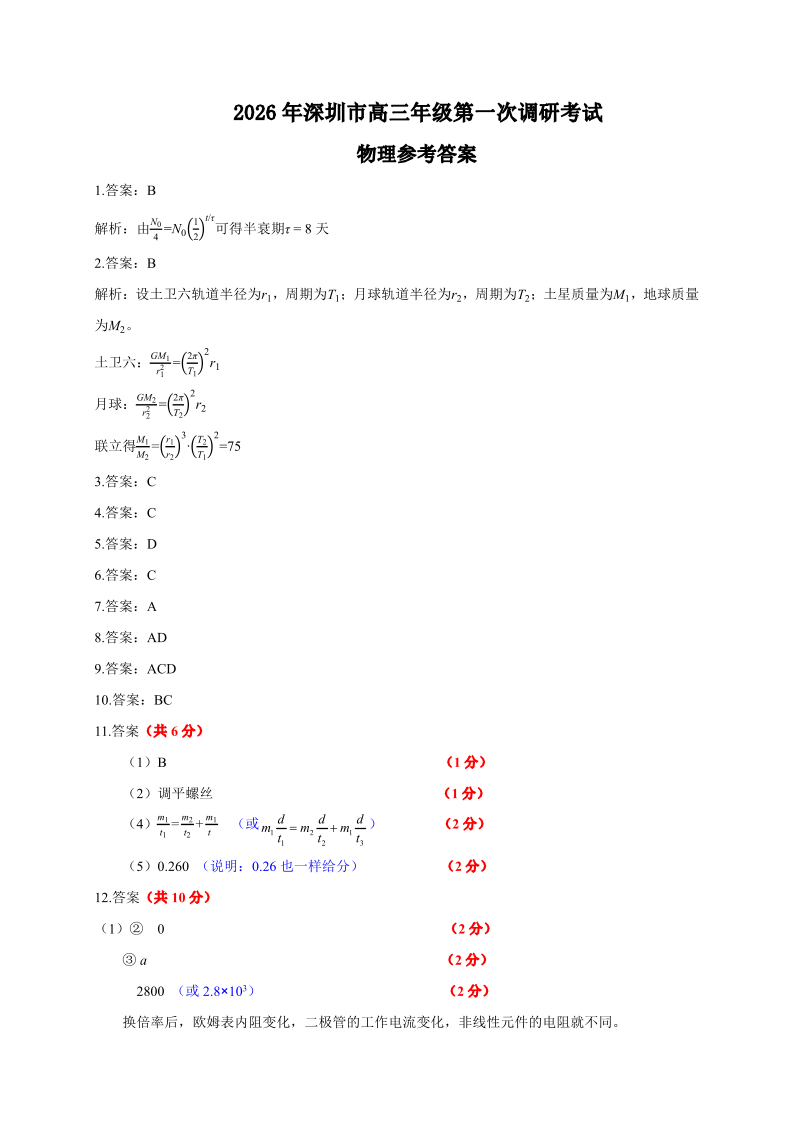 2026年深圳市高三年级第一次调研考试 物理答案.pdf