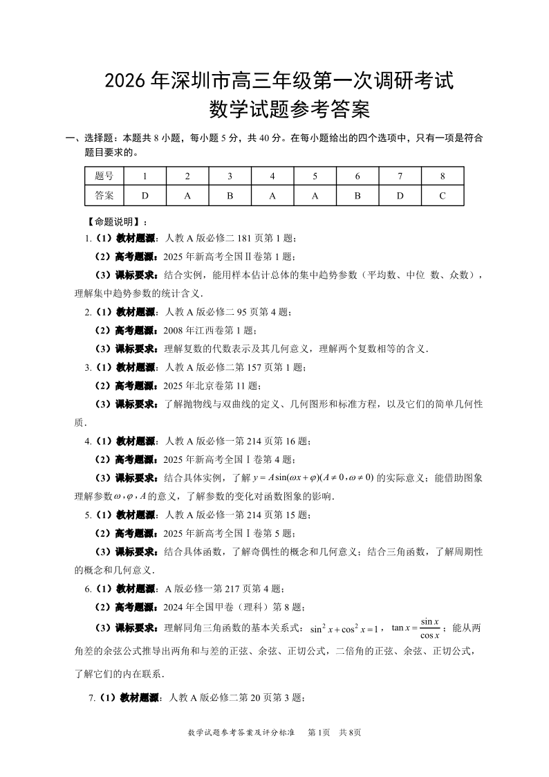 2026年深圳市高三年级第一次调研考试 数学答案.pdf