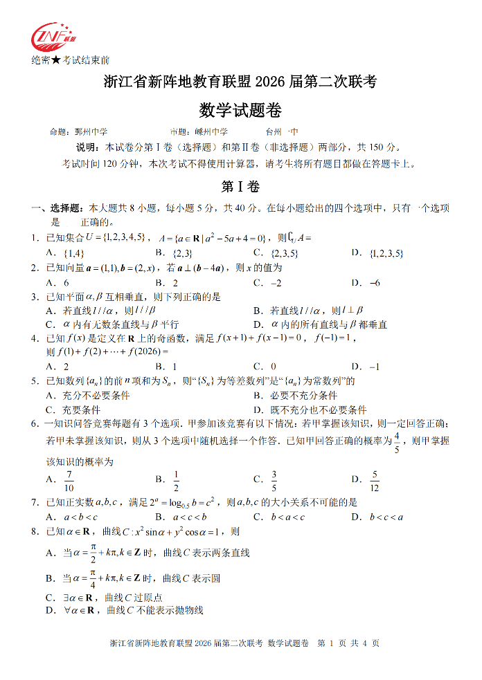浙江省新阵地教育联盟2026届第二次联考 数学.pdf