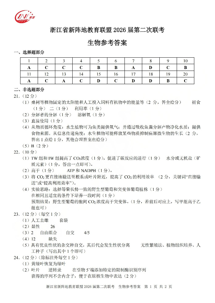 浙江省新阵地教育联盟2026届第二次联考 生物答案.pdf