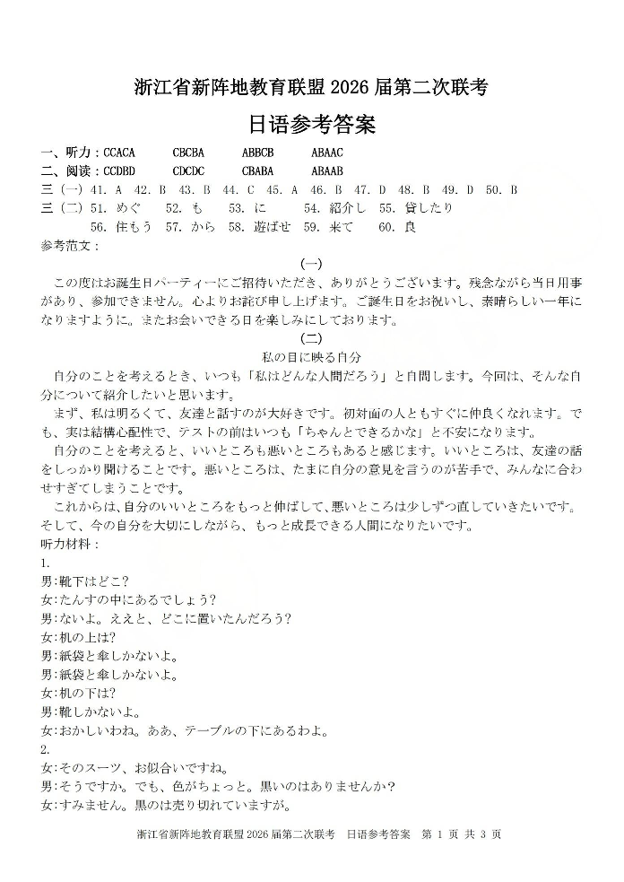 浙江省新阵地教育联盟2026届第二次联考 日语答案.pdf