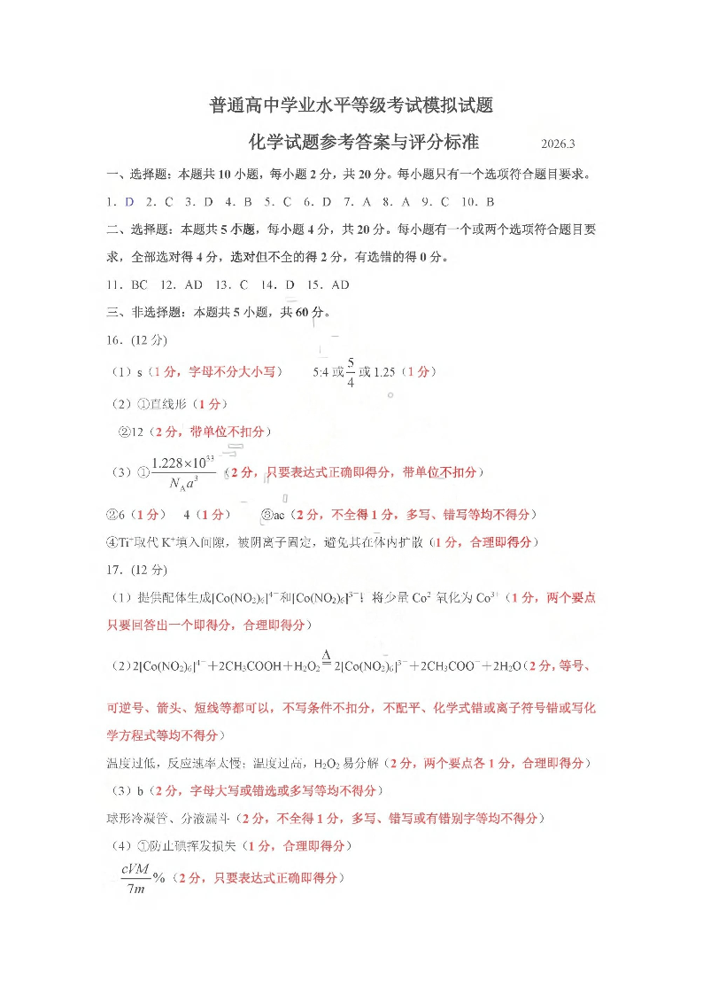 临沂市2026年普通高等学校招生全国统一考试(模拟)化学答案.pdf