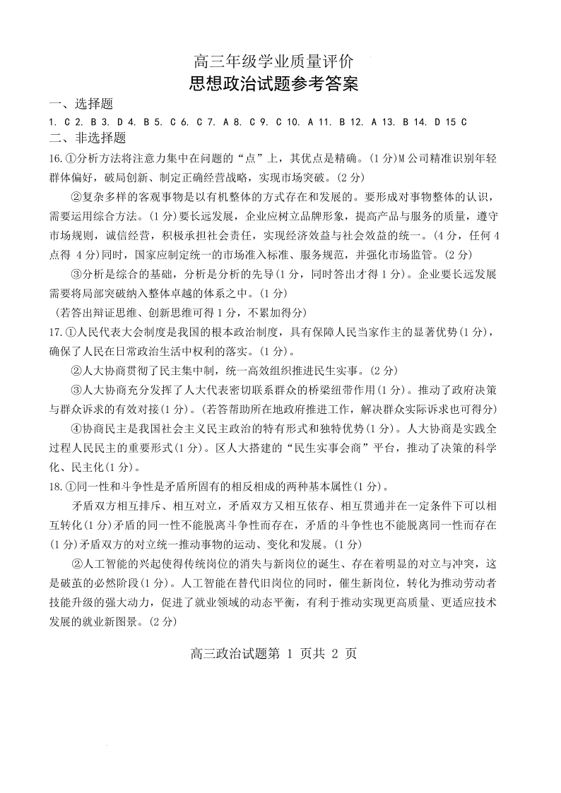 山东省东营市2026届高三年级第一次诊断性测试 政治答案.pdf
