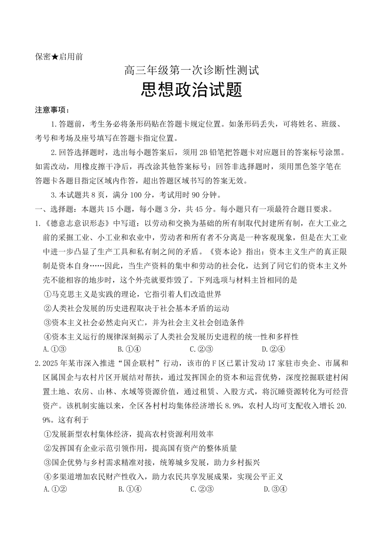山东省东营市2026届高三年级第一次诊断性测试 政治.pdf