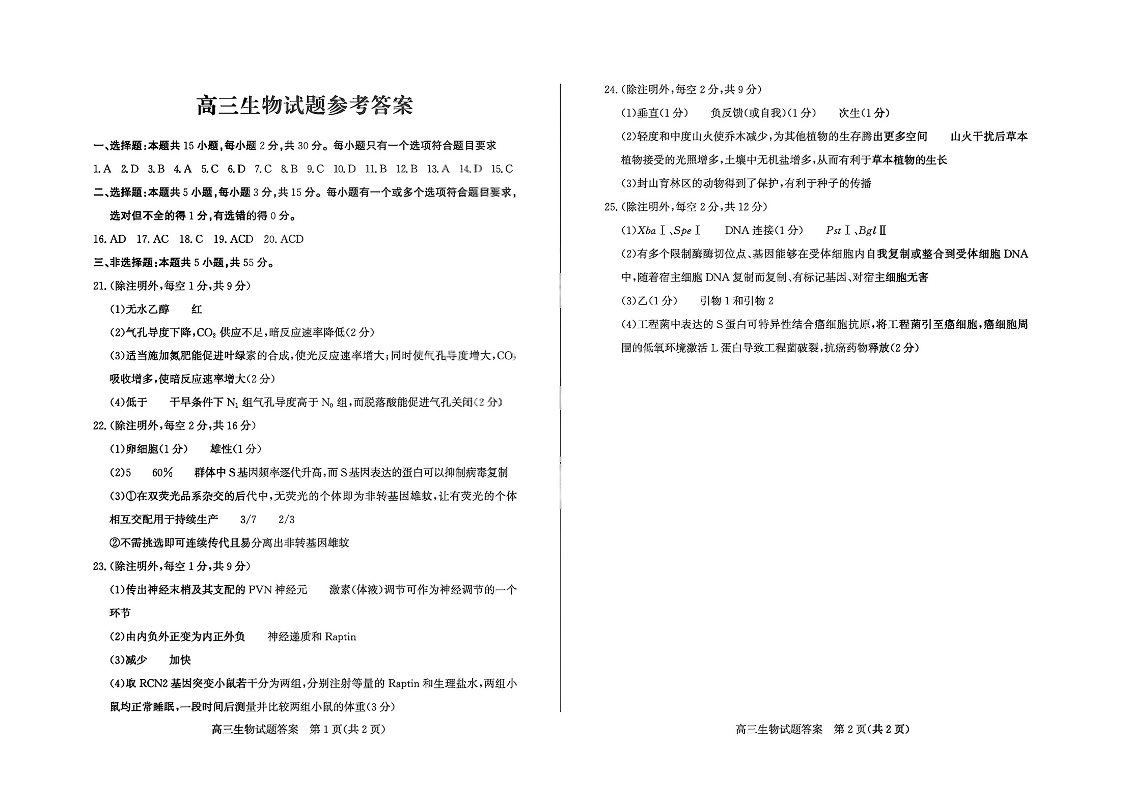 山东省德州市2026届高三年级一模考试 生物答案.pdf