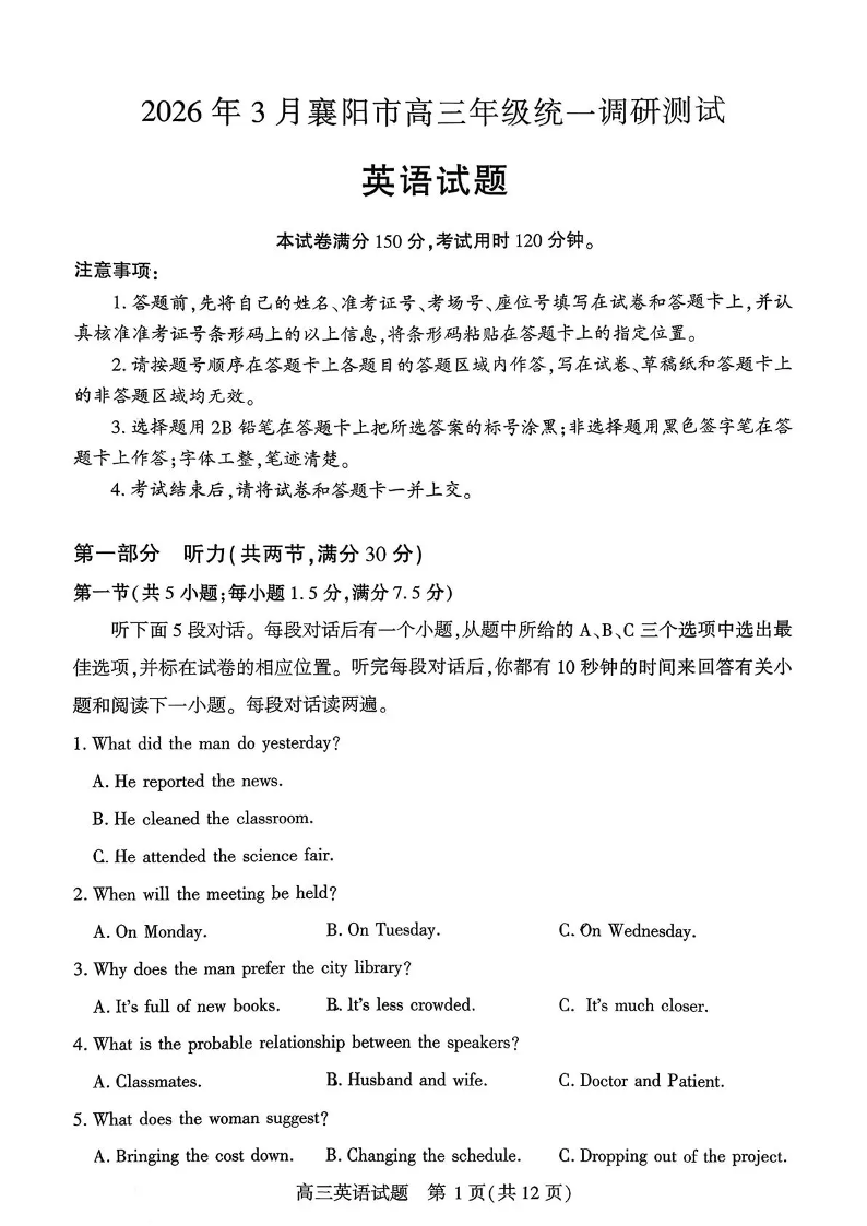 2026年3月襄阳市高三年级统一调研测试 英语.pdf