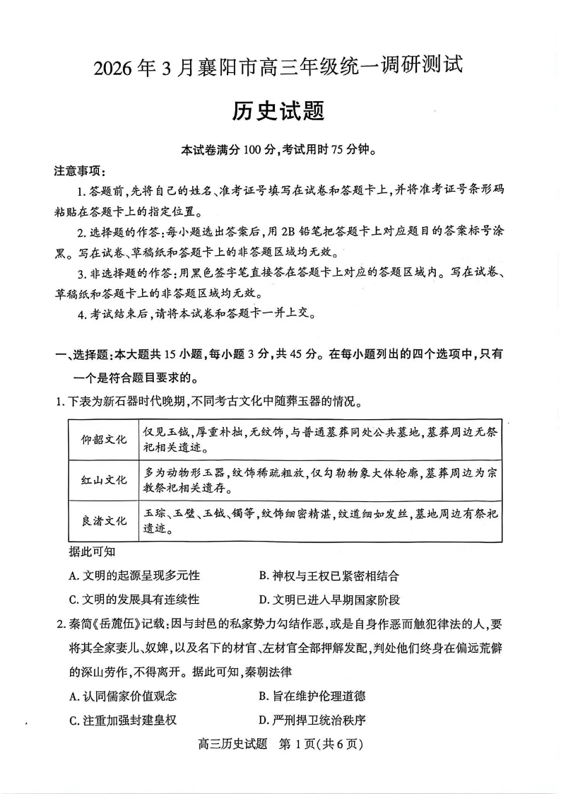 2026年3月襄阳市高三年级统一调研测试 历史.pdf