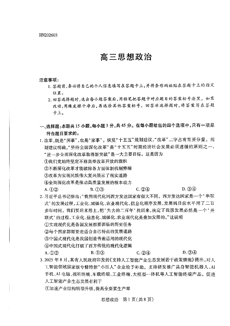 天一大联考河南高三开学考素质评价 政治.pdf