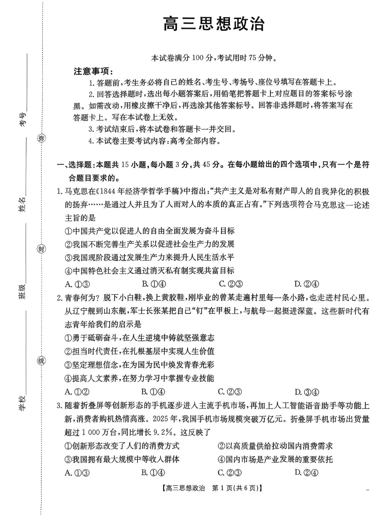 河南省2026届高三下学期3月开学联考 政治.pdf