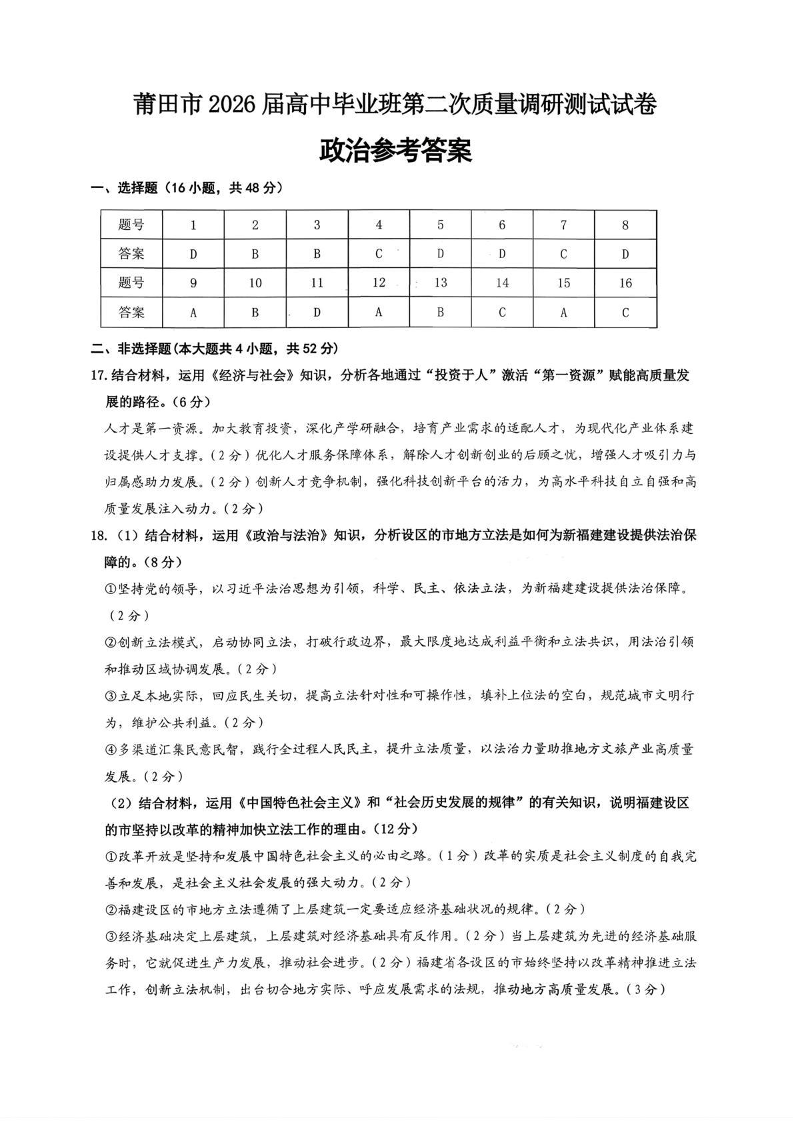 莆田市2026届高中毕业班第二次质量调研测试试卷 政治答案.pdf