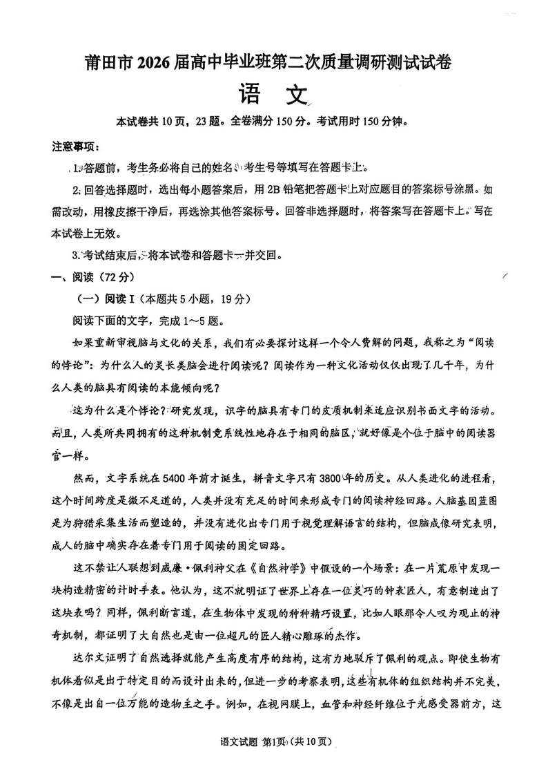 莆田市2026届高中毕业班第二次质量调研测试试卷 语文.pdf