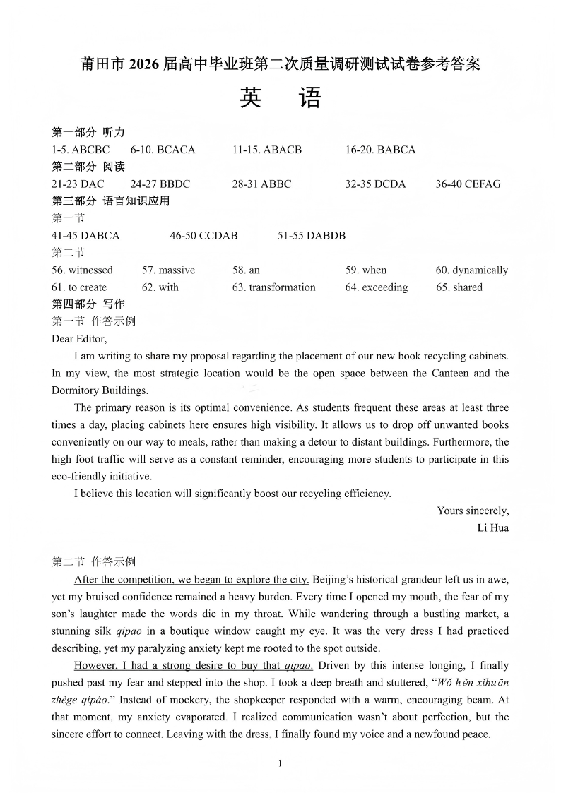 莆田市2026届高中毕业班第二次质量调研测试试卷 英语答案.pdf