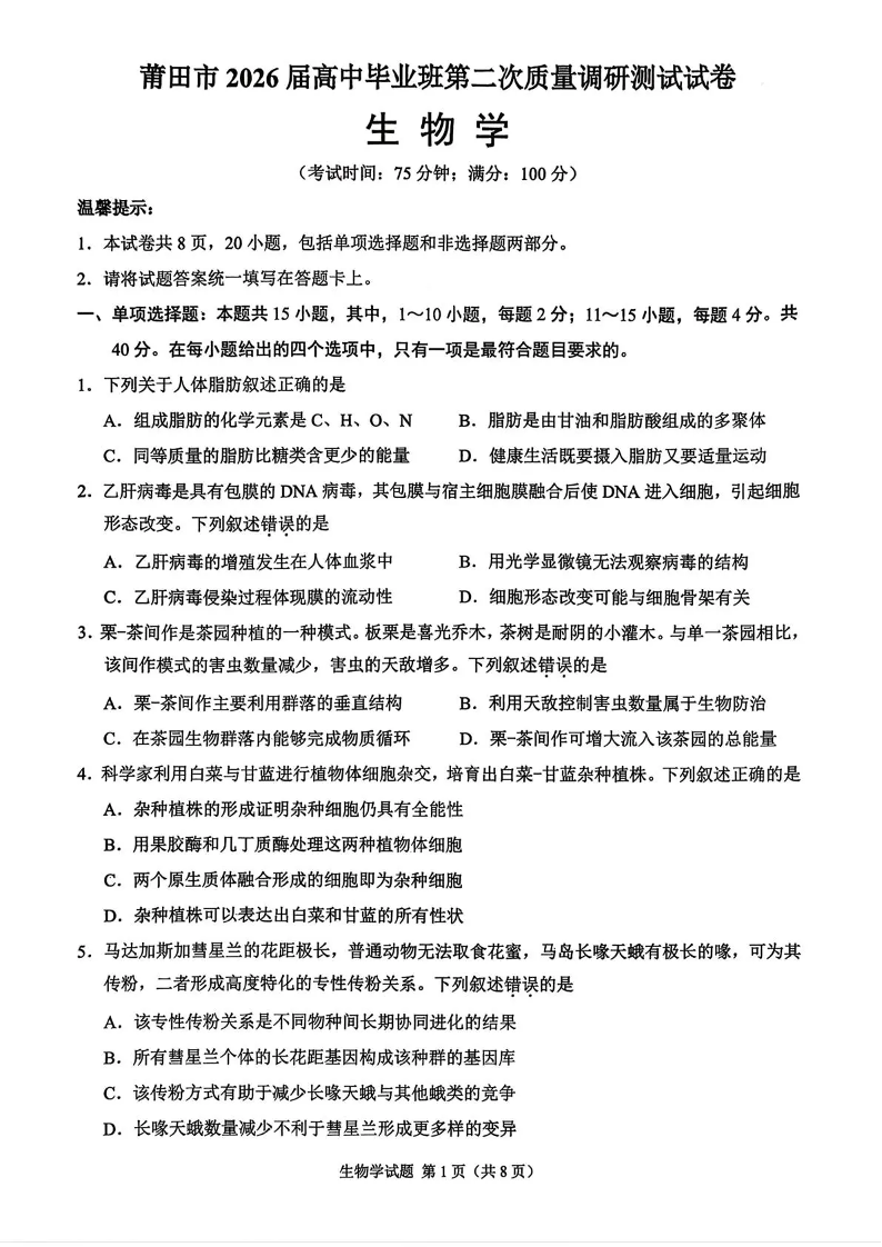 莆田市2026届高中毕业班第二次质量调研测试试卷 生物.pdf