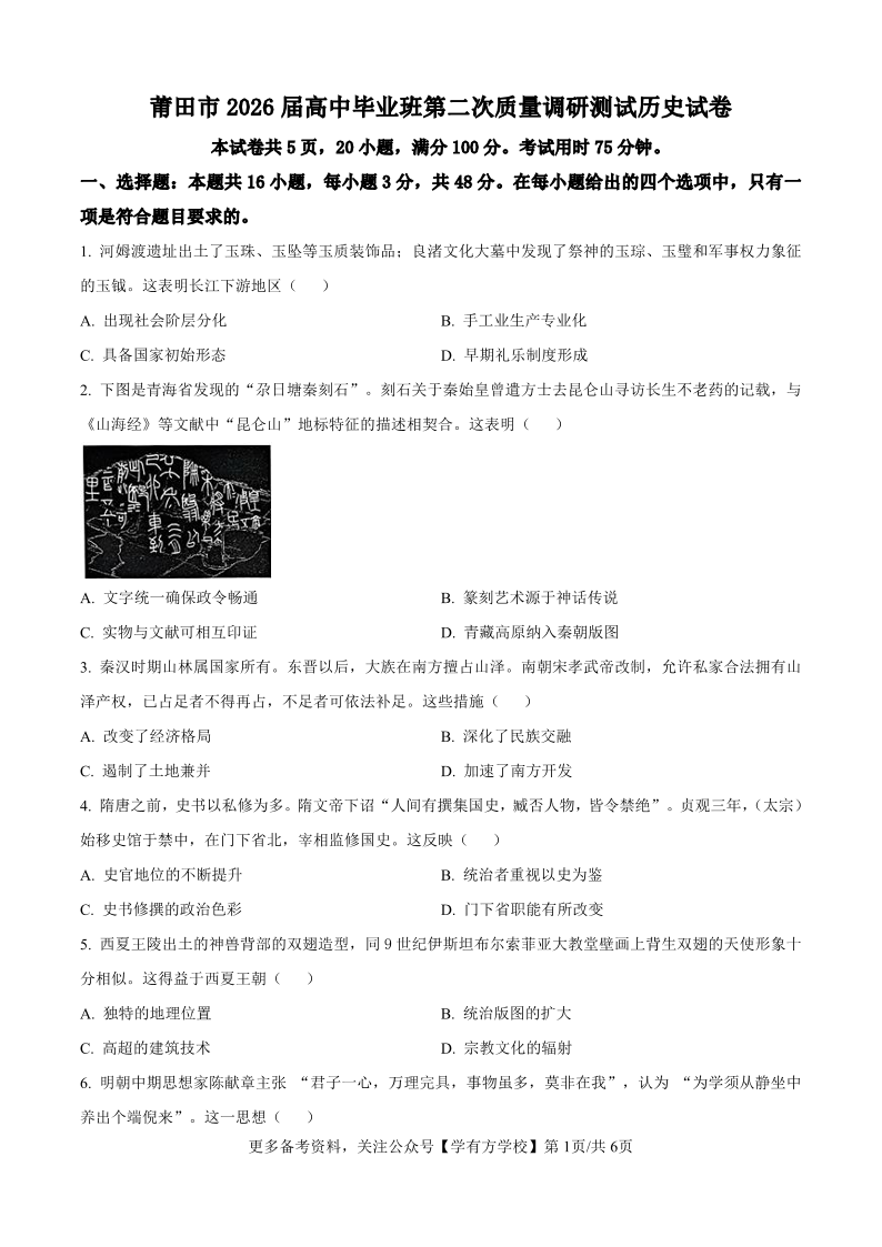 莆田市2026届高中毕业班第二次质量调研测试试卷 历史.pdf