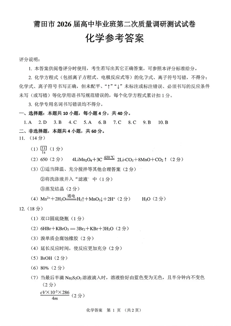 莆田市2026届高中毕业班第二次质量调研测试试卷 化学答案.pdf