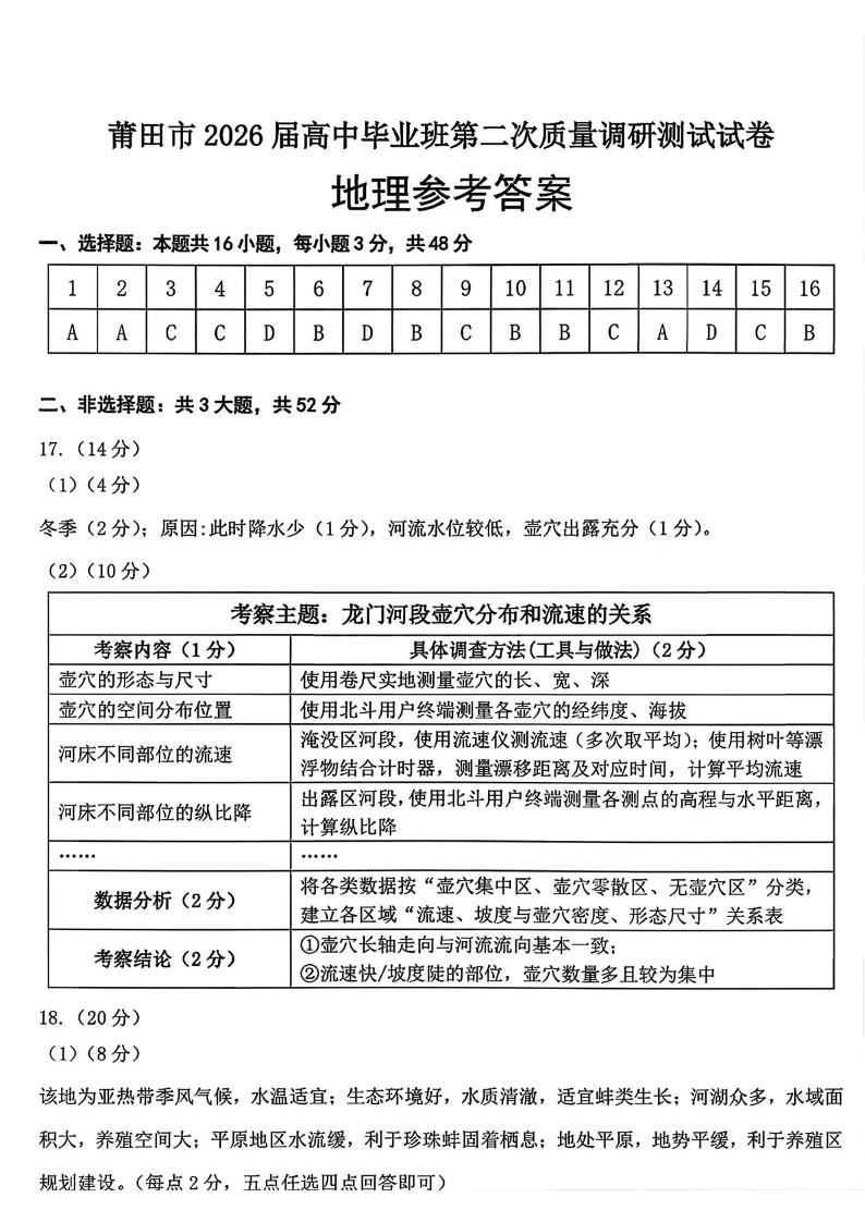 莆田市2026届高中毕业班第二次质量调研测试试卷 地理答案.pdf