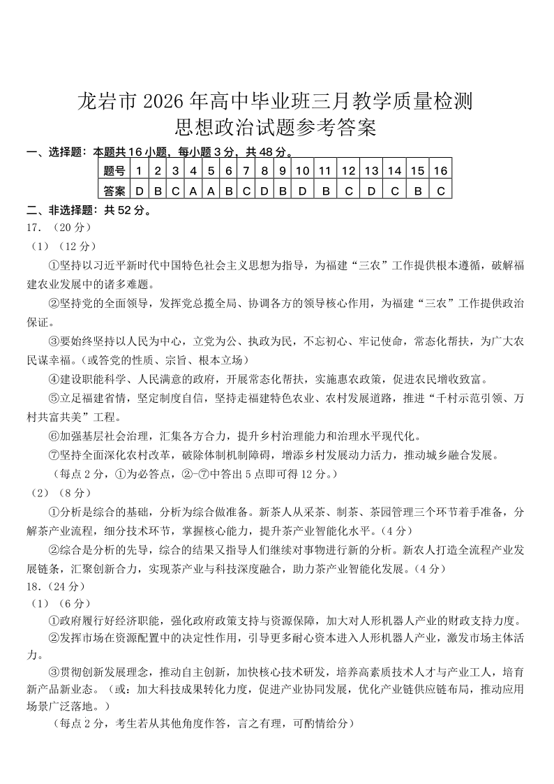 龙岩市2026年高中毕业班三月教学质量检测 政治答案.pdf