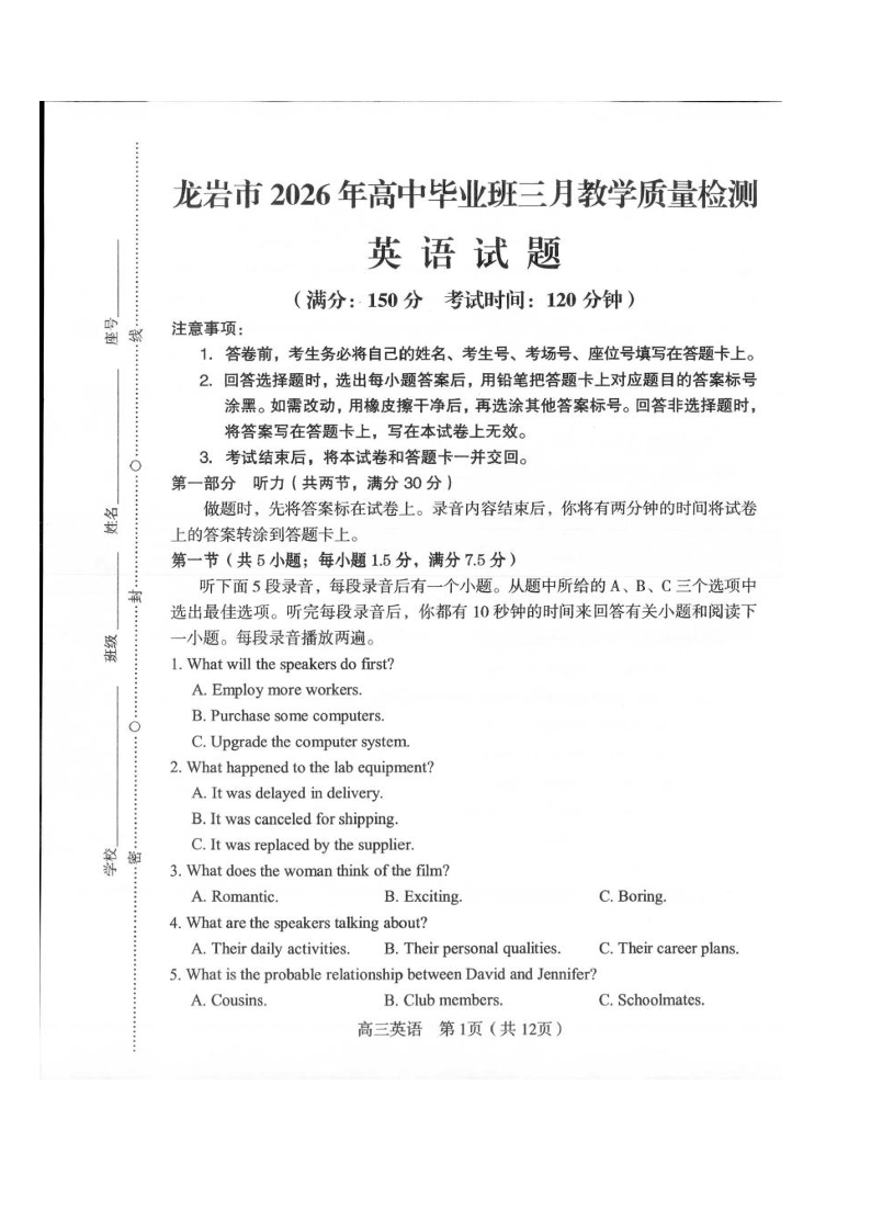龙岩市2026年高中毕业班三月教学质量检测 英语.pdf