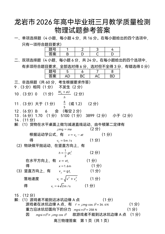 龙岩市2026年高中毕业班三月教学质量检测 物理答案.pdf
