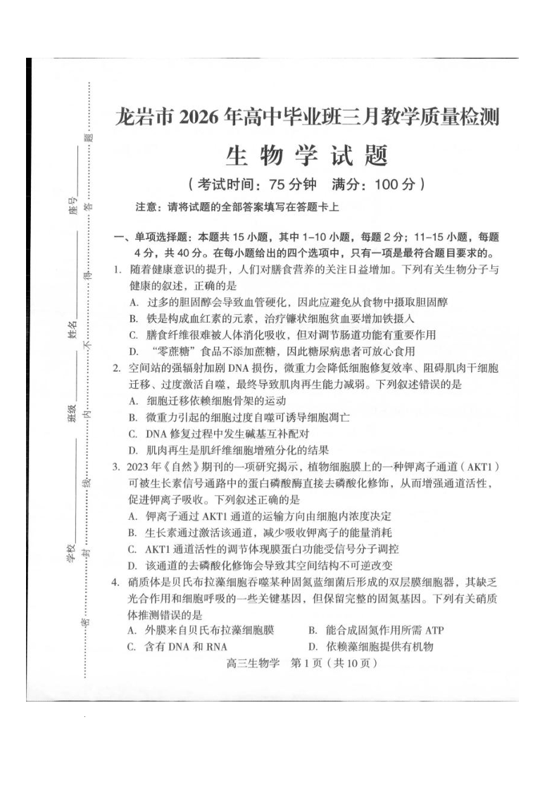 龙岩市2026年高中毕业班三月教学质量检测 生物.pdf
