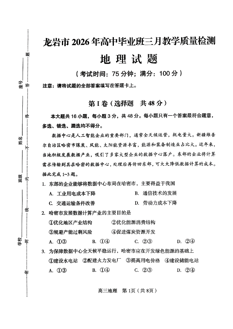 龙岩市2026年高中毕业班三月教学质量检测 地理.pdf