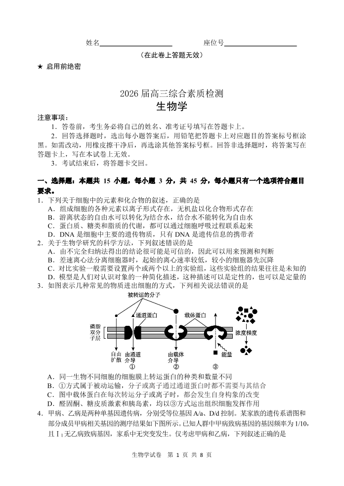 江南十校2026届高三综合素质检测 生物.pdf