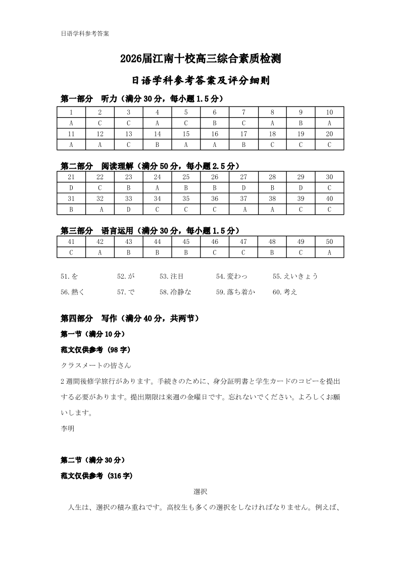 江南十校2026届高三综合素质检测 日语答案.pdf