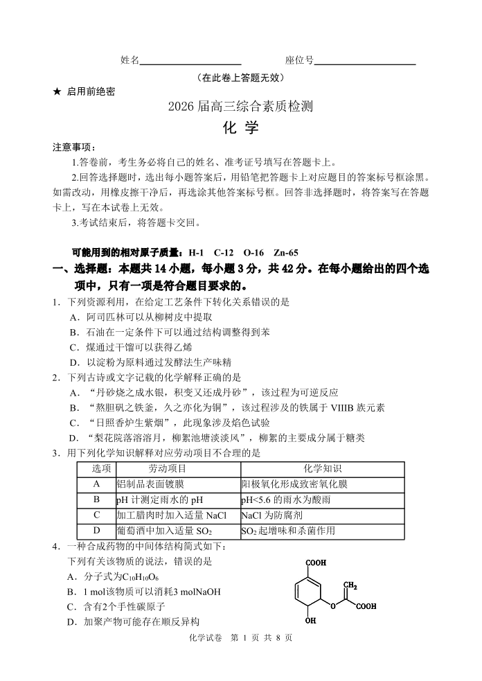 江南十校2026届高三综合素质检测 化学.pdf
