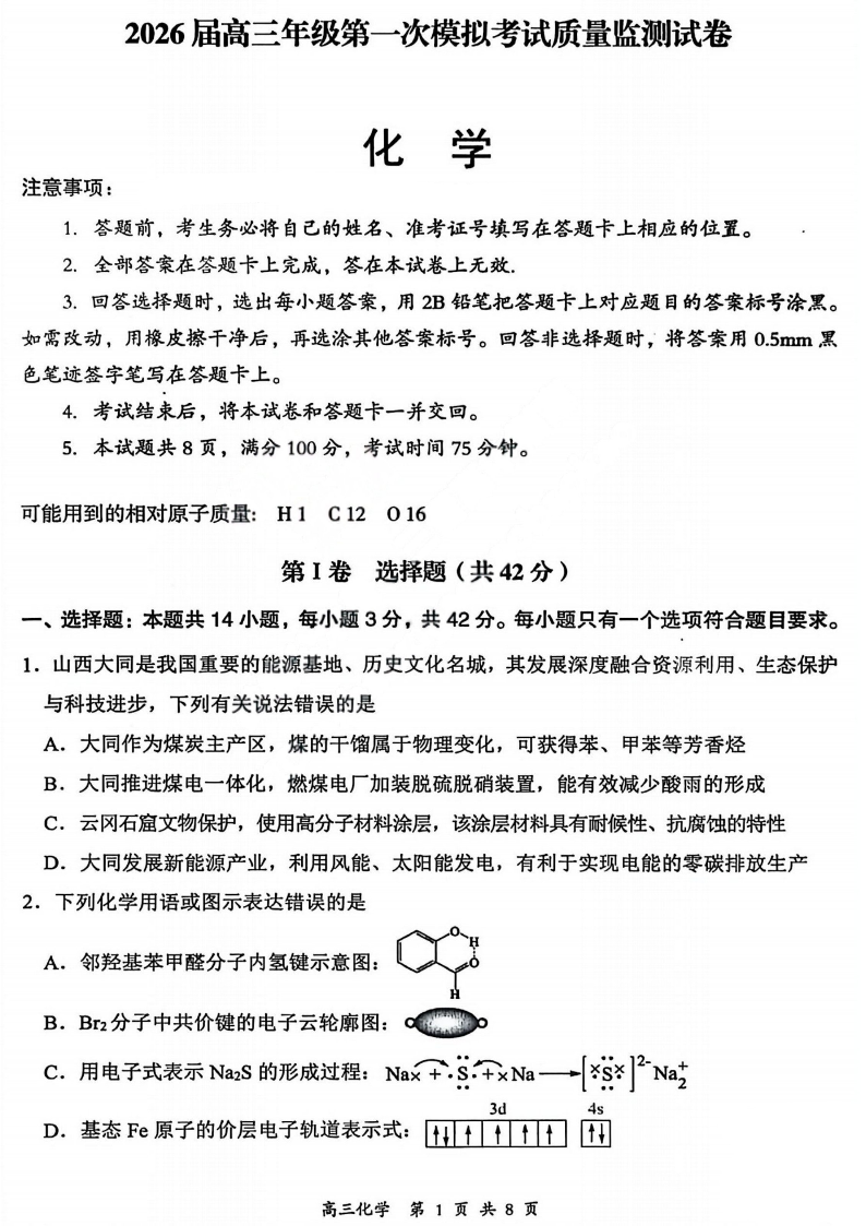 山西省大同市2026届高三年级第一次模拟考试质量监测 化学.pdf