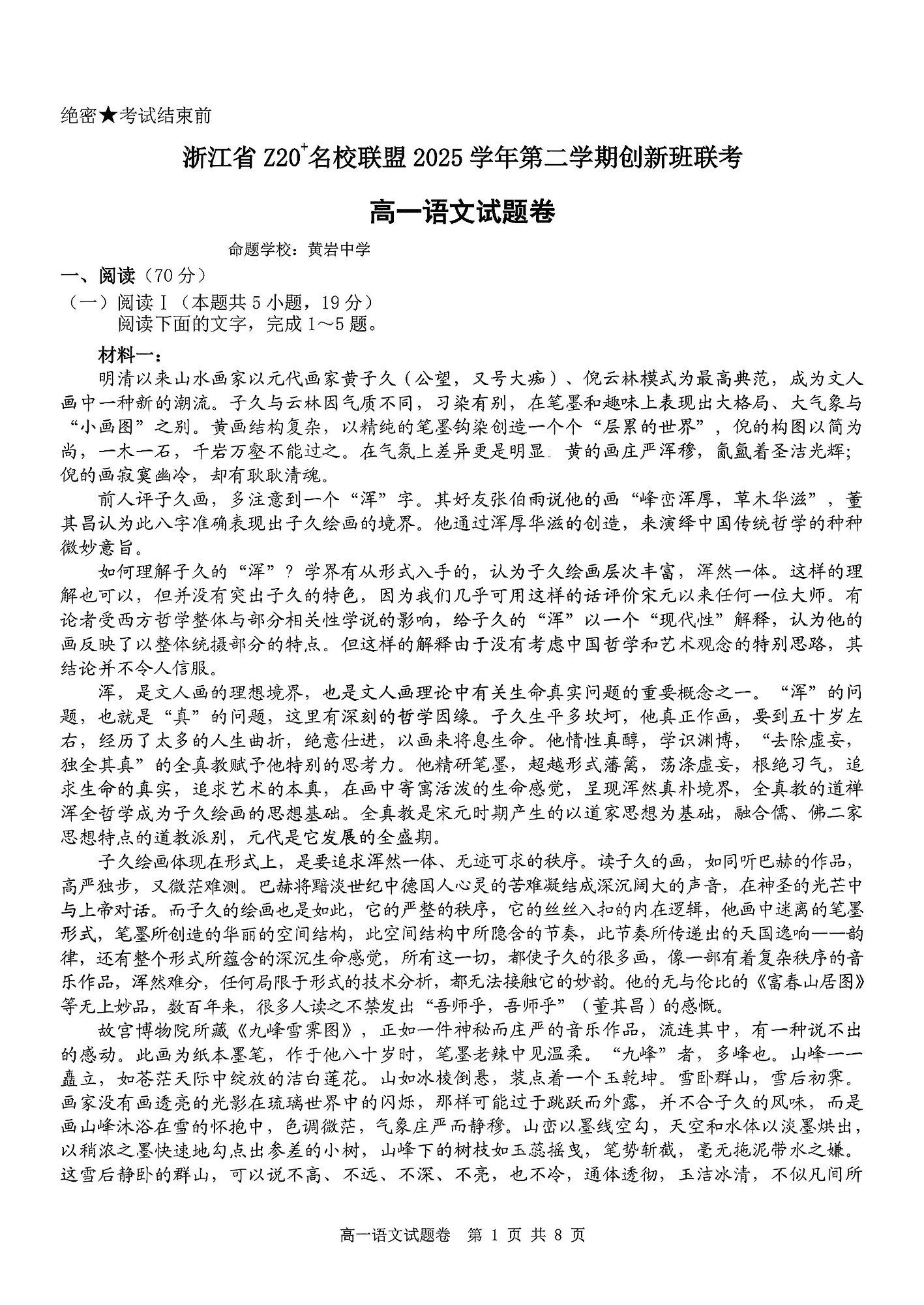 浙江省Z20名校联盟2025-2026学年高一创新班开学联考 语文试题(含答案).pdf