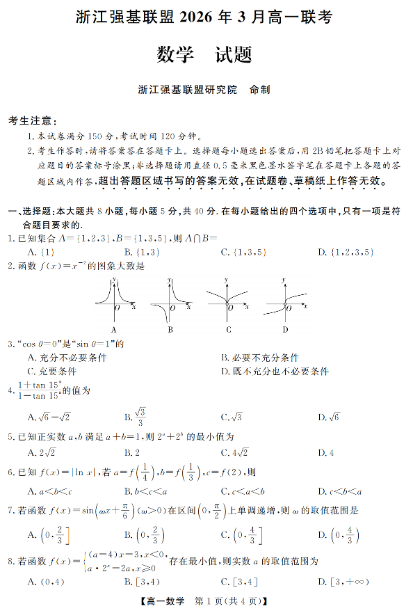 浙江强基联盟2026年3月高一联考 数学.pdf