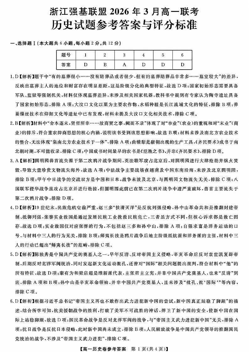 浙江强基联盟2026年3月高一联考 历史答案.pdf