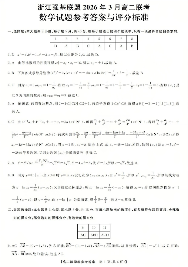 浙江强基联盟2026年3月高二联考 数学答案.pdf