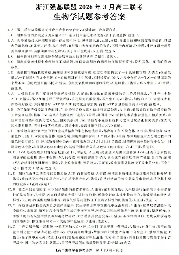 浙江强基联盟2026年3月高二联考 生物答案.pdf