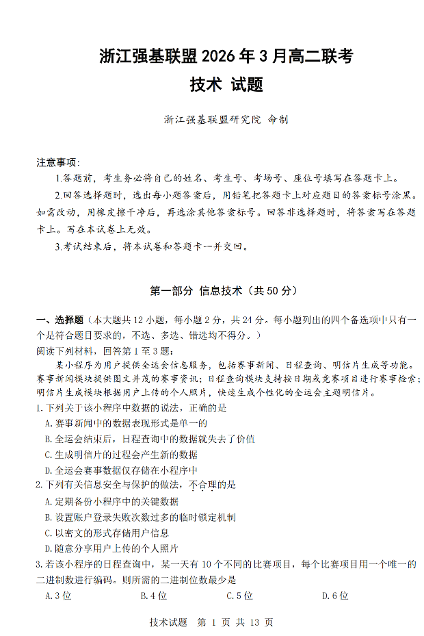 浙江强基联盟2026年3月高二联考 技术.pdf