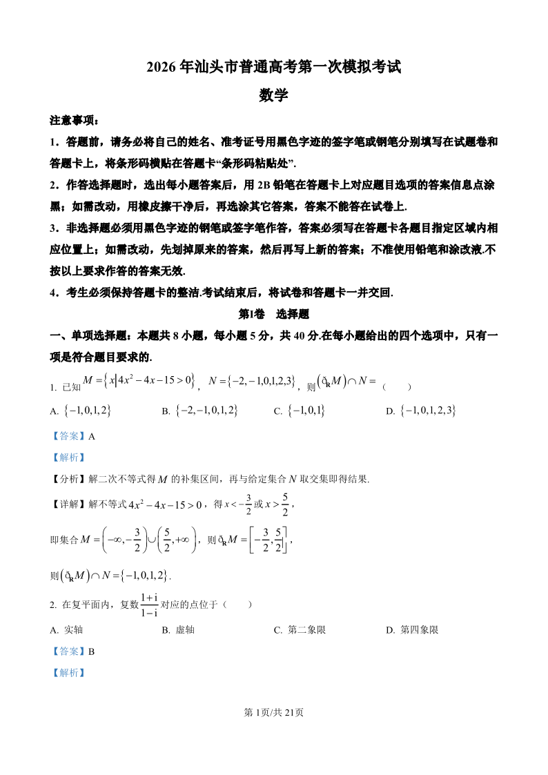 2026年汕头市普通高考第一次模拟考试 数学答案.pdf